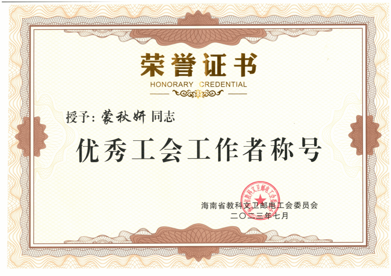 近日,海南省教科文卫邮电工会第二次代表大会在海口召开。会上对2021-2022年度海南省教科文卫邮电工会系统先进集体和先进个人进行表彰。PA视讯官网法学院蒙秋妍荣获“海南省教科文卫邮电工会系统优秀工会工作者”称号。