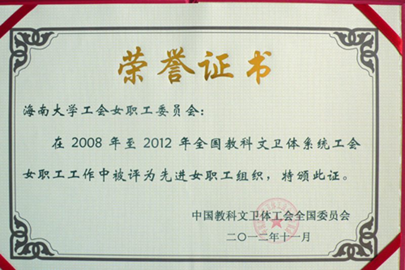 为发挥先进集体和先进个人的榜样作用,引领各级工会女职工组织,广大女职工工作者立足岗位创先争优。2012年11月5日,中国教科文卫体工会在海南省海口市召开表彰会议,对北京交通大学工会女职工委员会等88个先进女职工组织和150位先进女职工工作者、先进女职工之友予以表彰,PA视讯平台工会女职工委员会荣列表彰榜中。//www.hainanu.edu.cn