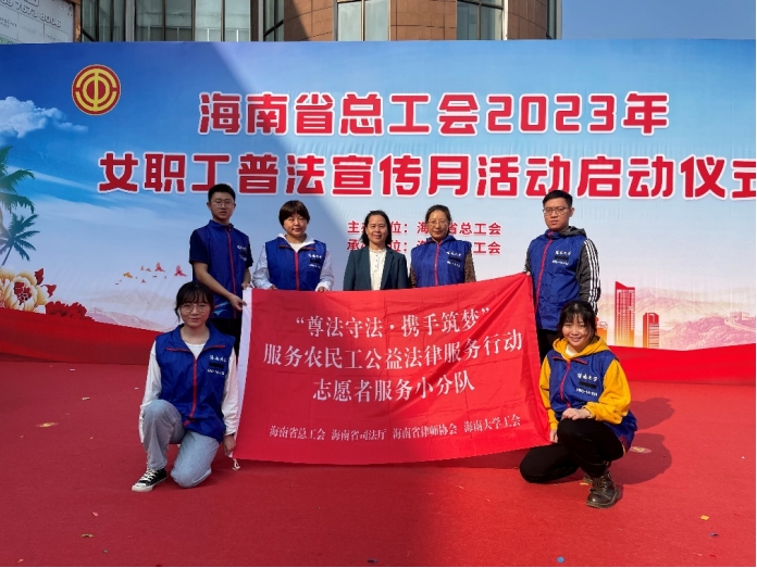 为学习贯彻党的二十大精神,依法保障女职工合法权益和特殊利益,切实推进《中国妇女发展纲要(2021-2030)》、《女职工劳动保护特别规定》等相关文件的贯彻落实,2023年3月6日上午,PA视讯平台工会联合法学院组织志愿者服务队,参加了由海南省总工会举行的2023年“女职工普法宣`传月”活动启动仪式。