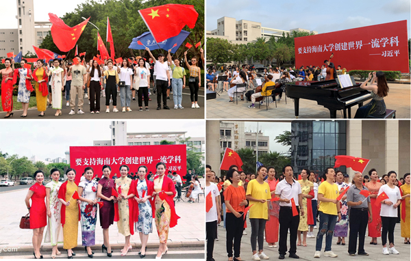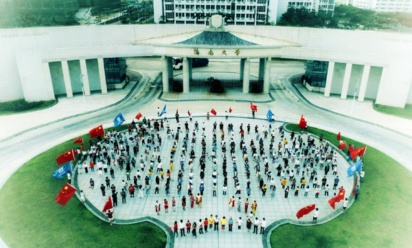 . 活动当天,大家沐浴着南国温煦的阳光,旗袍会的队员们身着旗袍,肩披大红丝巾,手扬五星小红旗,和数百名教师、学生代表一起,在校园的文化柱下,在北门隽刻着“海纳百川、大道致远”校训的大石前,在气派的新南门广场上,唱响了《我爱你,中国》。